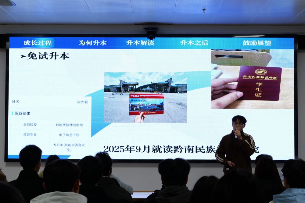 分享会邀请多元主体参与,采用“线上+线下”结合模式。部分无法到场的专升本学子通过预制视频,传递备考经验与升学心得;现场分享环节干货满满,免试考入黔南民族师范学院的向少毅同学详解免试升本途径,袁桃宇同学畅谈专升本备考心得,优秀毕业学长杨进超分享职场实战经验,另有魏坚学长分享个人未来规划。