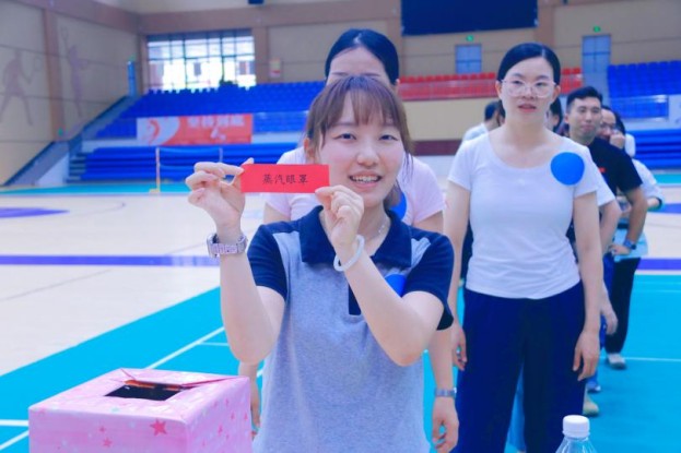 活动分为“抢水瓶”“你说我猜”“夹纸运杯”“抢椅子”四个项目进行。在“抢水瓶”项目中,两队教师面对面站立,中间放置水瓶,裁判发出指令后,红蓝两队教师迅速反应争夺水瓶,现场气氛热烈,欢乐不断。