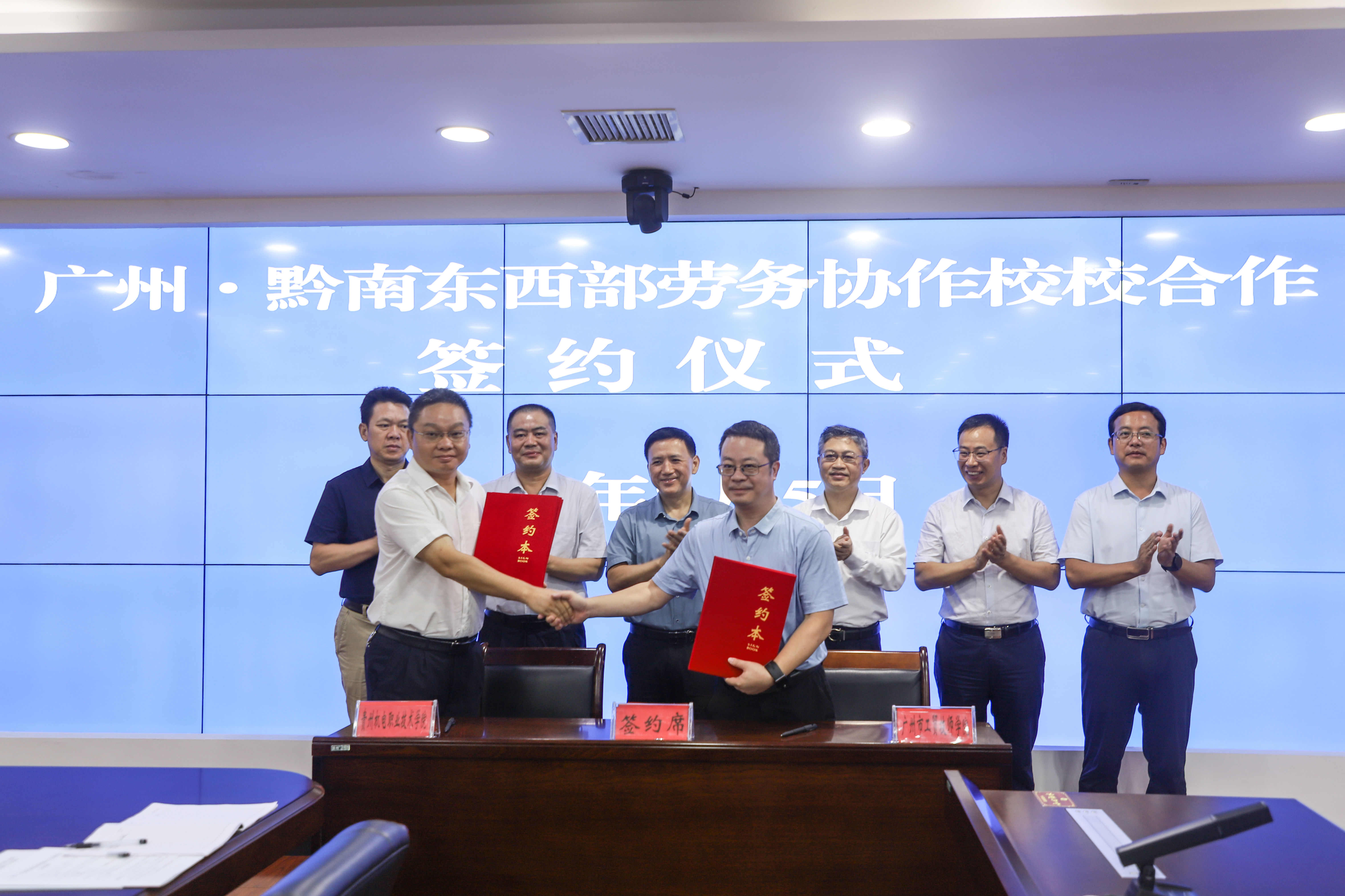 为深入学习贯彻习近平总书记关于深化东西部协作和定点帮扶的重要讲话和重要指示批示精神,积极落实粤黔两省党委政府的部署要求,深化粤黔教育精准帮扶,根据《广州市人力资源和社会保障局关于印发<广州市对口帮扶贵州省毕节市、黔南州、安顺市劳务协作实施“三项工程”等项目工作方案>的通知》要求,在广州市人社局、黔南州人社局的指导和支持下,我院与广州市工贸技师学院在前期开展对口帮扶取得积极成效的基础上,双方继续深化校校合作,助力粤黔东西部协作走深走实,8月5日上午,学院副院长范先龙带队赴黔南州三都县参加了广州·黔南东西部劳务协作工作座谈会,在随后校校合作签约仪式上我院与广州市工贸技师学院签订了《深化粤黔东西部协作校校合作协议书》。