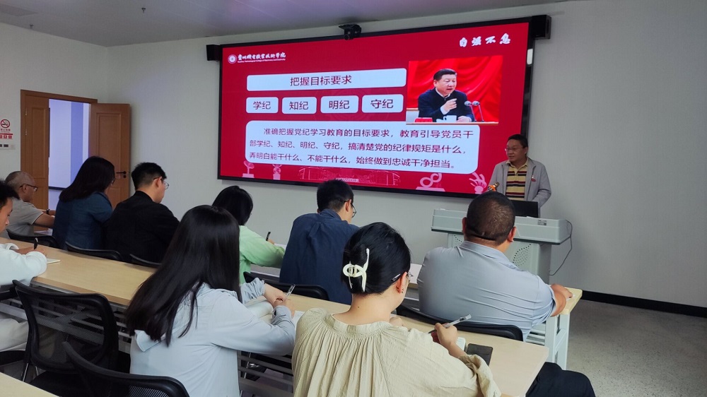 为深入学习习近平总书记关于党纪学习教育的重要讲话和重要指示精神,全面贯彻落实《中共贵州机电职业技术学院委员会关于在全院开展党纪学习教育的实施方案》,扎实做好党纪学习教育工作,5月22日,车辆工程系党总支联合行政部门党支部在图书馆306室开展党纪学习教育专题党课,范先龙副院长以《以案学纪》为题讲授党纪学习教育专题党课。车辆工程系党总支、行政部门党支部全体党员(含预备党员、发展对象、入党积极分子),以及图书馆、机电教学科研所、教学质量监测中心全体党员和后勤管理科主要负责人参加学习。本次党课由行政部门党支部副书记申桐主持。