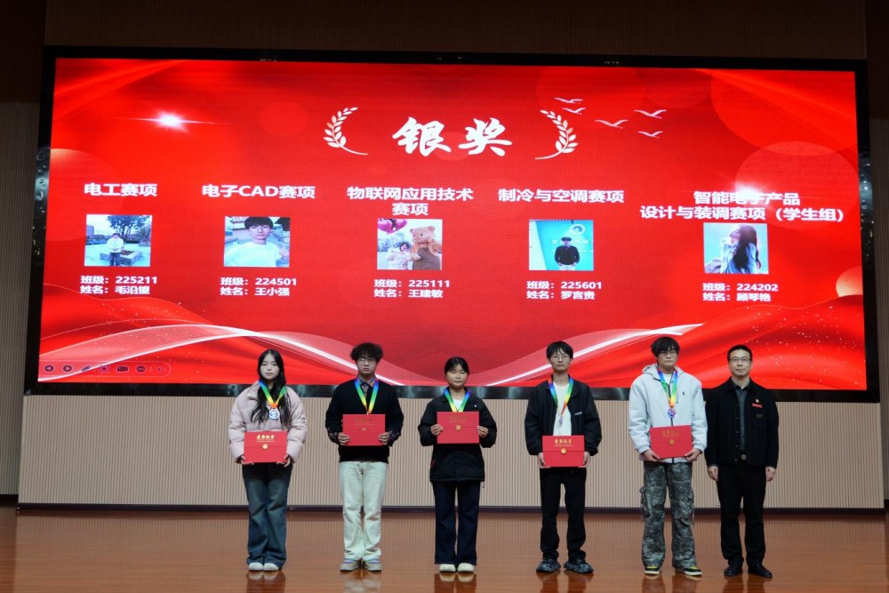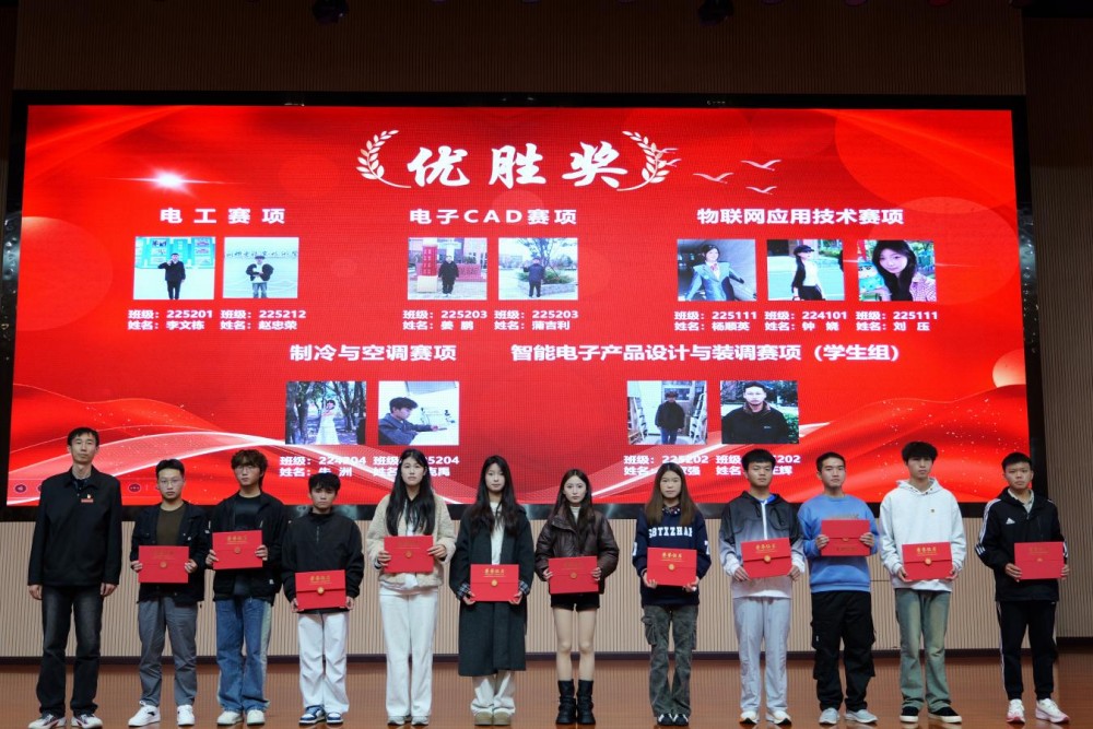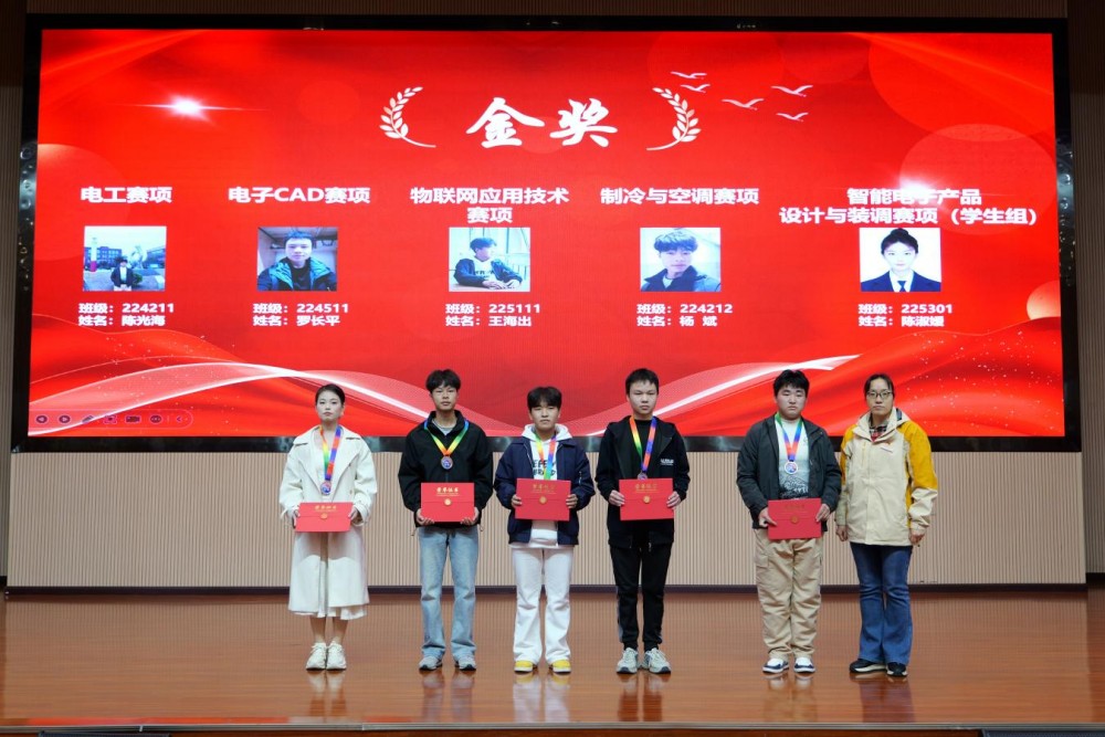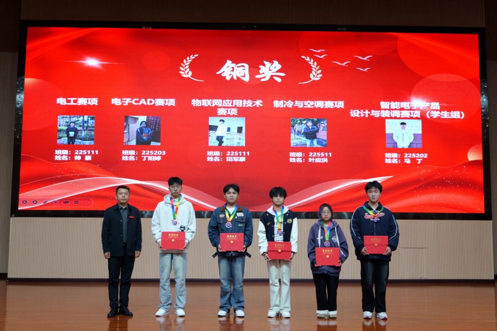 仪式在赛事回顾视频中拉开帷幕。视频生动再现了选手们在电工技术、电子CAD、物联网应用技术、制冷与空调、智能电子产品设计与装调等五个赛项中的精彩表现,展现了他们扎实的技能功底、专注的竞赛态度与不断突破的创新精神。一个个镜头,记录的不仅是技术的比拼,更是匠心与青春的碰撞。