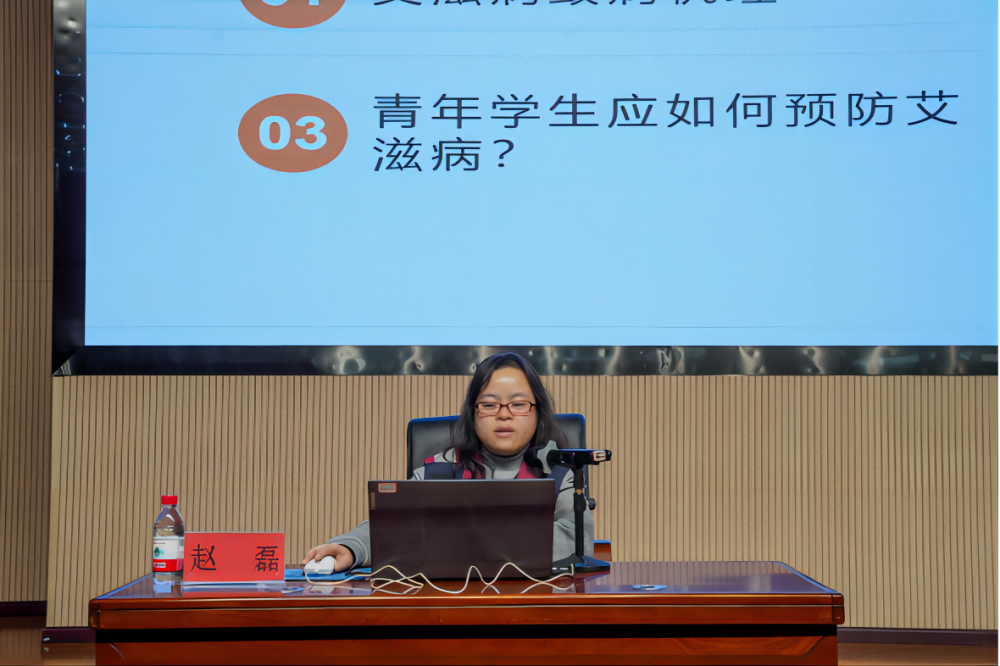 11月28日,学院举办防艾宣传讲座,由后勤管理科副科长袁晓燕主持,讲座特邀都匀市疾控中心艾滋病防治科科长赵磊主讲。赵磊科长首先通过宣传视频向同学们介绍艾滋病基础知识,随后结合真实案例,以PPT形式系统讲解了艾滋病的传播途径、临床表现、防治要点及常见误区,并着重强调日常学习与生活接触不会传播艾滋病病毒,引导同学们增强自我保护意识,养成健康文明的生活方式。