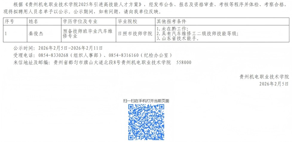 贵州机电职业技术学院2025年引进高技能人才拟聘人员公示