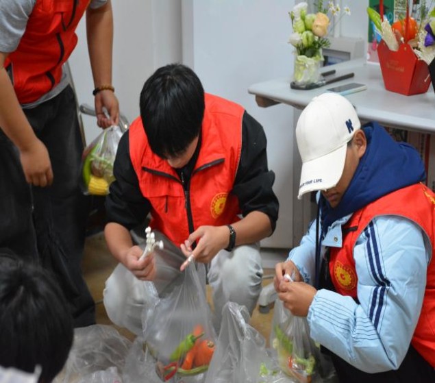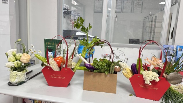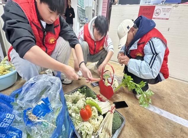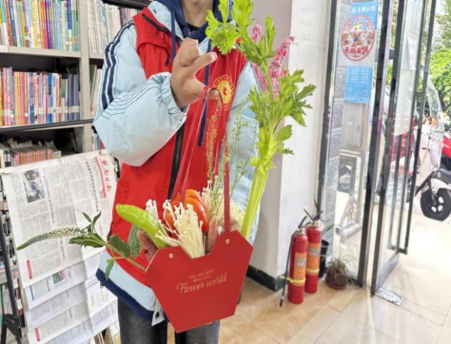 随后,活动进入“蔬香酿美・花艺预创”筹备阶段。志愿者们与社区工作人员分工协作,对新鲜瓜果蔬菜进行细致摘选,按色彩、形态、大小分类分拣,确保每一份食材都能适配花艺创作的多样需求;接着,大家合力制作示范蔬果花束——从蔬果搭配、色彩协调到造型构思,一步步打磨作品细节,用直观的范例为老人们搭建“创作参考模板”,既帮老人快速理解创作思路,也为他们后续发挥灵感、轻松参与做好铺垫。