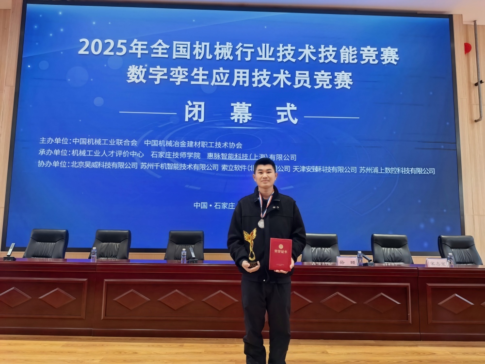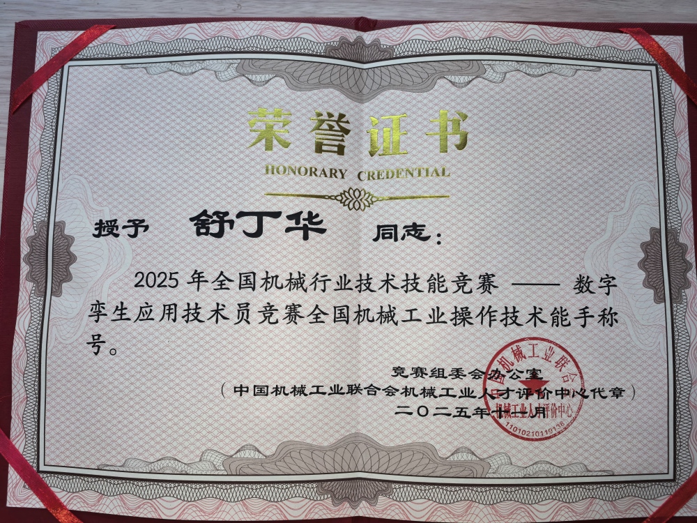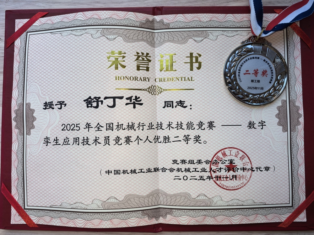 近日,在2025年全国机械行业技术技能竞赛——数字孪生应用技术员赛项中,我院机械工程系教师舒丁华凭借精湛技艺,成功斩获全国二等奖(银牌)并荣获“全国机械工业操作技术能手”称号,学院荣获“团体优秀奖”。