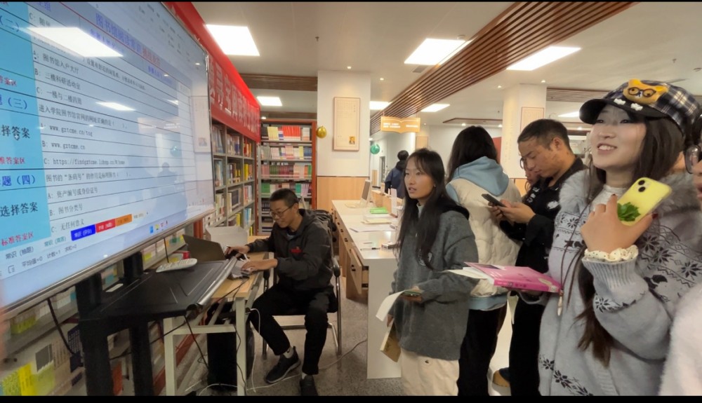 开幕式结束后,参赛师生们立即投入到第一环节——寻宝“思”:寻出“任务”,智力挑战(11月5日-7日)的紧张角逐中。图书馆一楼大厅气氛热烈,大家排队、分组、抽签,根据索书号在书海中快速搜索目标图书,随后投入紧张的智力挑战赛——图书常识竞答、字谜挑战、拼图挑战。现场既有紧张的计时比拼,也有互助协作的温暖瞬间,充分点燃了大家的阅读兴趣与竞争意识。